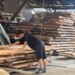 山口市のH様のお宅です。暖炉と木のベンチとテーブル。